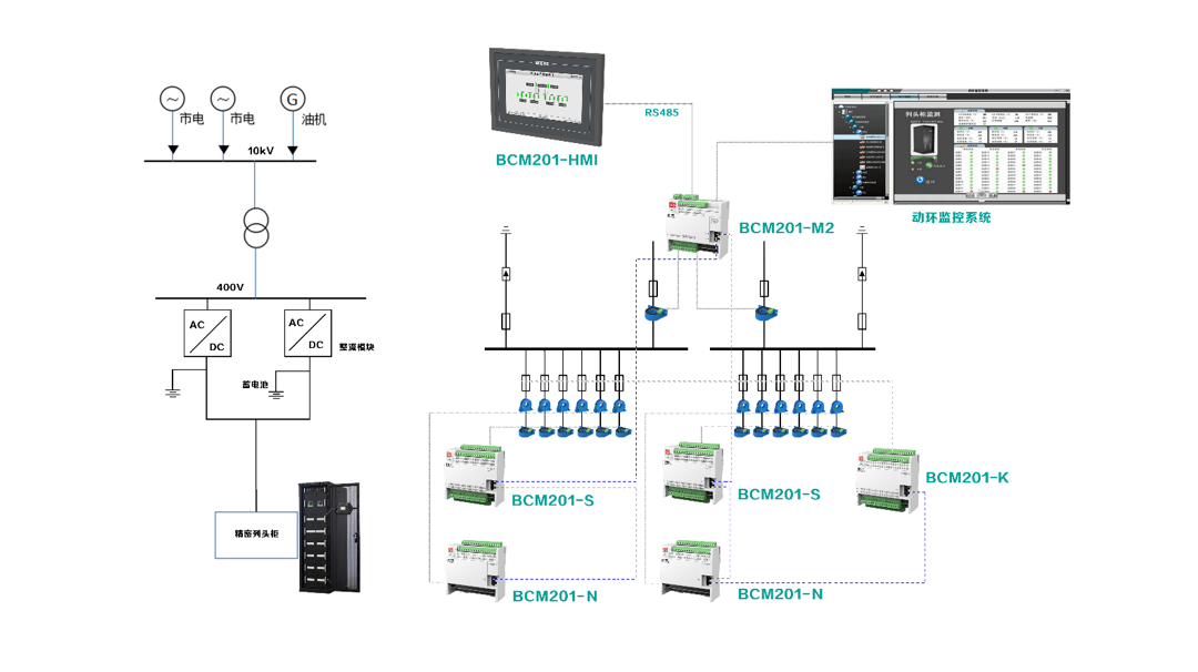 進線回路采用BCM201-M1模塊監(jiān)測1路直流進線,出線回路配置一個BCM201-S監(jiān)測模塊,實現(xiàn)對進線及各個出線回路的電壓、電流、有功功率、電能、極值、需量。同時配置BCM201-N監(jiān)測模塊,實現(xiàn)隔離母線對地電壓及對地絕緣電阻測量。