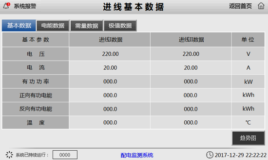實時監(jiān)測進線回路基本數(shù)據(jù),包括電壓、電流、功率、電能數(shù)據(jù)。