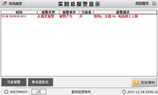 查詢電量越限報警記錄,顯示歷史報警信息;詳細記錄報警電量、報警類型及報警起始時間;通過查詢歷史事件可追溯報警時運行線路的狀態(tài)。