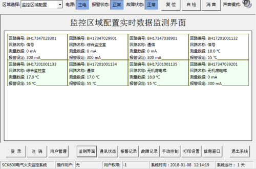 系統(tǒng)實(shí)時(shí)監(jiān)測(cè)各回路的剩余電流及溫度,并在主界面顯示詳細(xì)回路名稱編號(hào)內(nèi)容以及各類功能按鈕。
