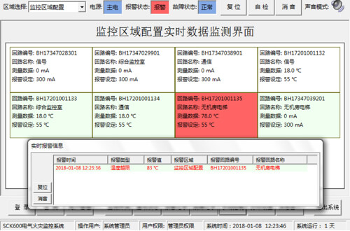 當(dāng)監(jiān)控設(shè)備系統(tǒng)檢測(cè)到現(xiàn)場(chǎng)任何探測(cè)器發(fā)生剩余電流或溫度超限報(bào)警,監(jiān)視界面對(duì)應(yīng)回路位置顯示紅色,并立即自動(dòng)彈出提示消息框顯示當(dāng)前所有存在的報(bào)警信息。