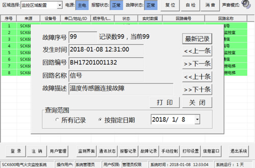監(jiān)控設(shè)備自動(dòng)記錄發(fā)生的越限報(bào)警和設(shè)備故障記錄,通過(guò)操作區(qū)按鈕“報(bào)警記錄”(或“故障記錄”)界面可查詢到所有報(bào)警(或故障)記錄,并可打印出指定報(bào)表行的記錄。