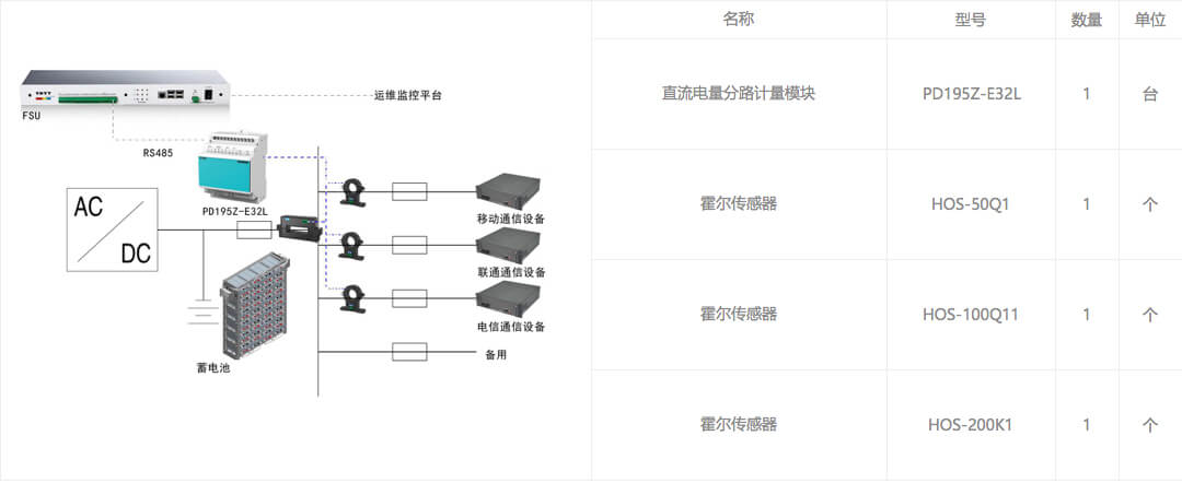 基站內的開關電源、空調、照明以及插座都由交流配電箱進行供電,并通過多回路交流表計實現高精度分路測量,而基站內各類通信設備主要是由直流系統進行供電,利用直流電量分路計量設備對不同運營商的通信設備實現能耗監測,最終都通過FSU設備接至運維監控平臺,實現對通信基站能耗的有效監測及運營管理。